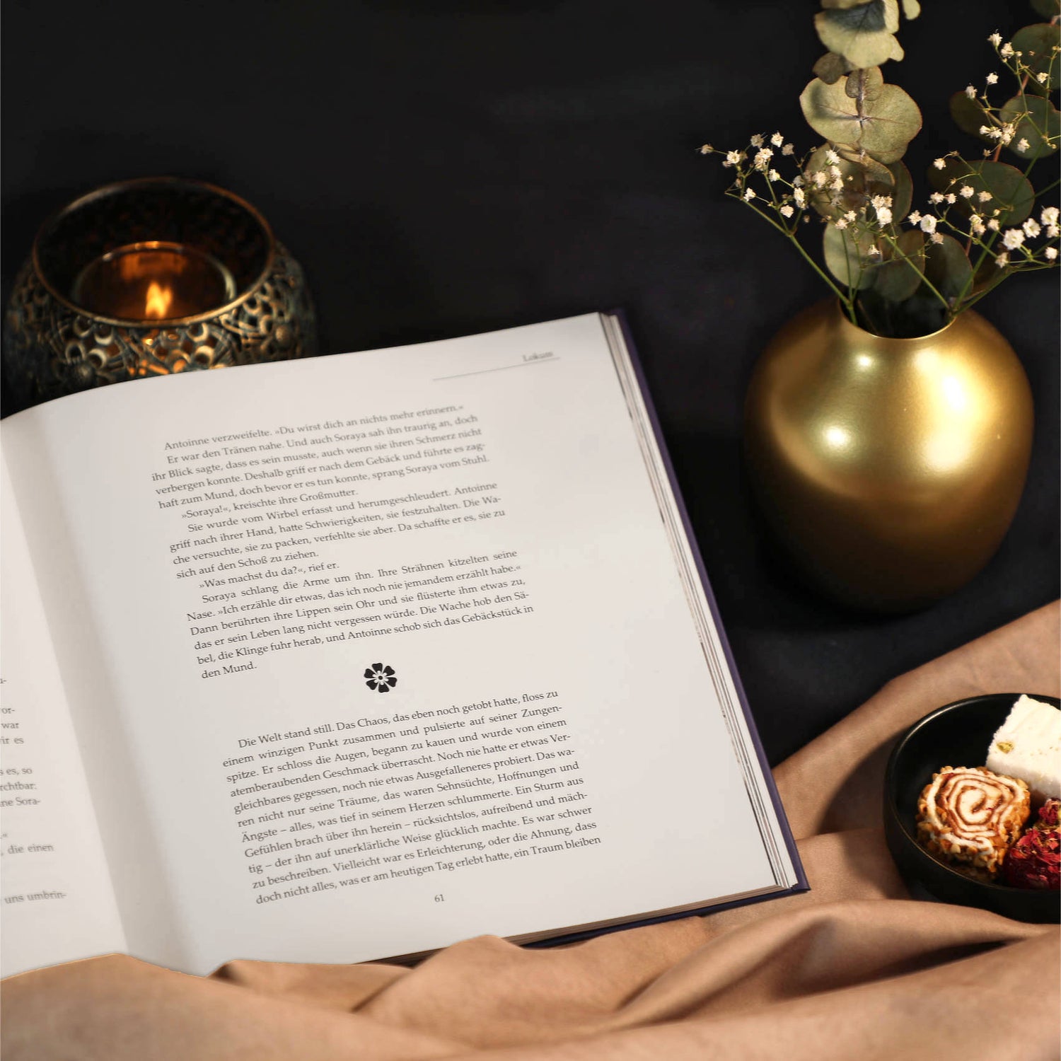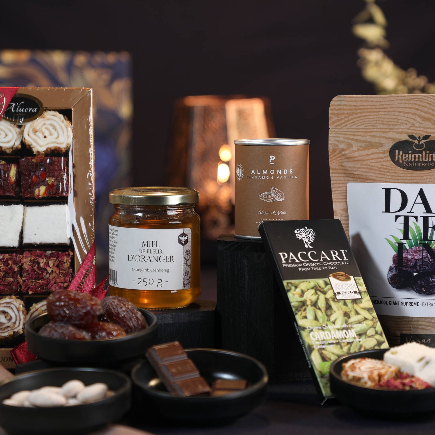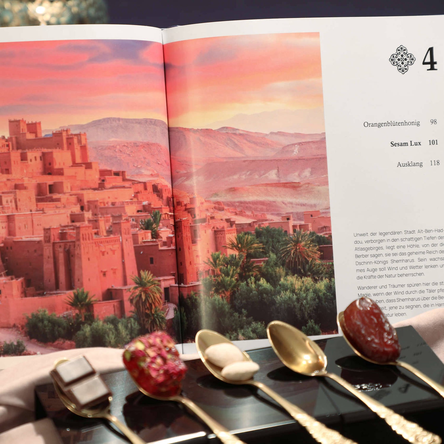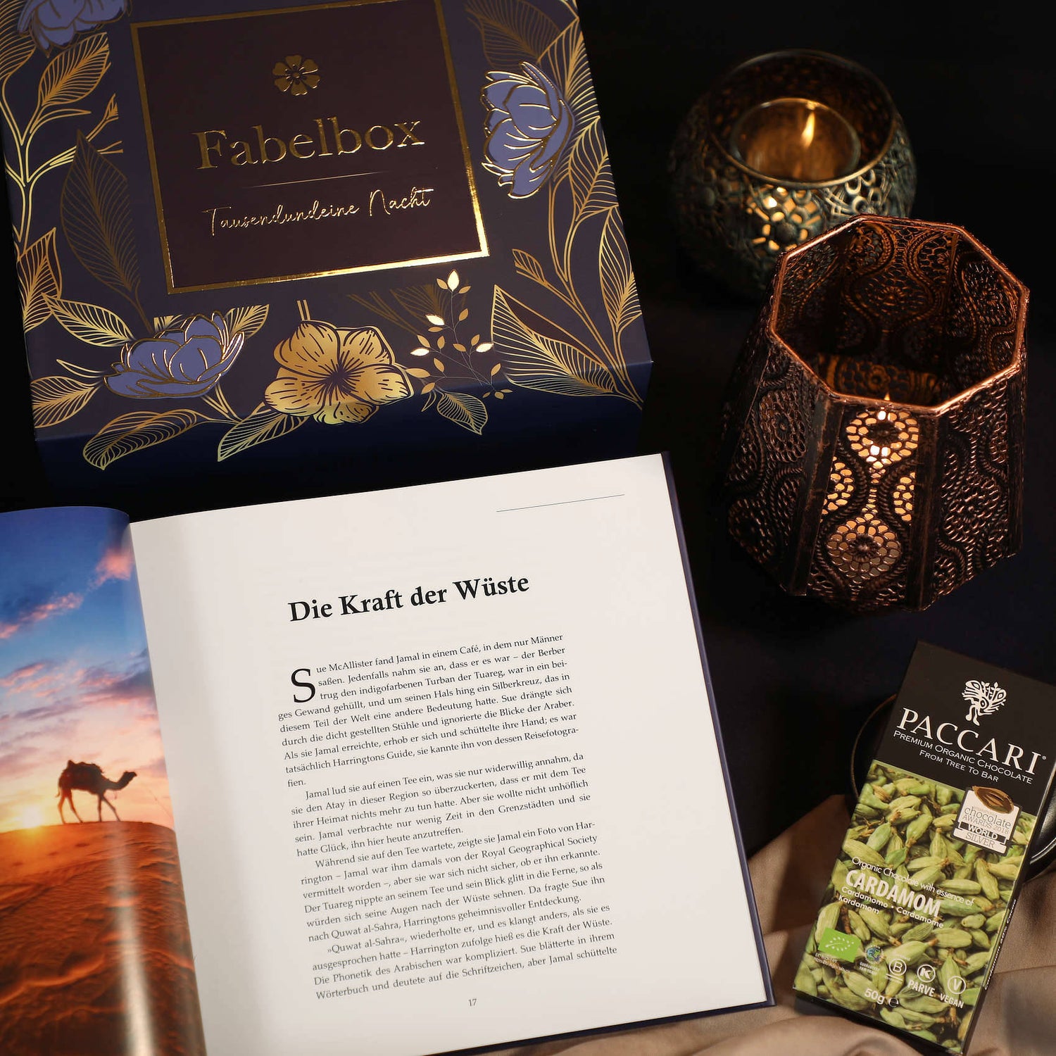 Jede Köstlichkeit ist sorgsam ausgewählt und geschmacklich auf die jeweilige Geschichte abgestimmt – von Kardamom-Schokolade bis zu Medjool-Datteln. Ein Erlebnis für alle, die feine Lebensmittel lieben.